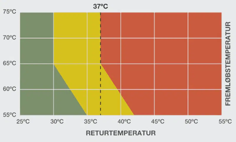 Ved gennemsnitlig fremløbstemperatur under 65°C